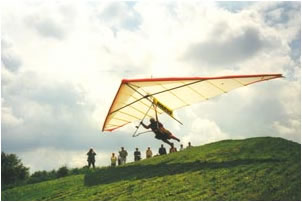 ![]() Aufgrund seiner großen Fläche bei niedrigem Gewicht besitzt er sehr gutmütige Start- und Landeeigenschaften, die bei Flugschülern Übungshangfrust erst gar nicht aufkommen lassen. Durch seine robuste Bauweise übersteht er auch härtere Landungen ohne großen Schaden. Der Grashüpfer ist bei der Flugschule Hochries im täglichen Übungshangeinsatz. Technische Daten: |